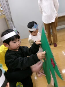 みんなはキラキラシールをツリーにいっぱい貼りました