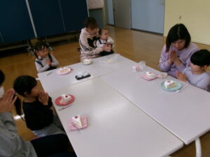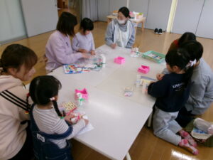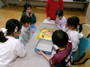 午前は幼稚園のお子さんが雪だるまのペン立てを作ったり、ゲームをしたりしました。